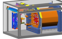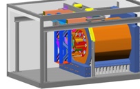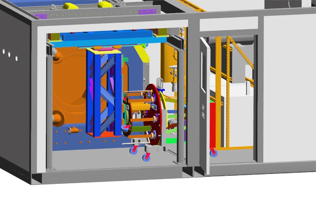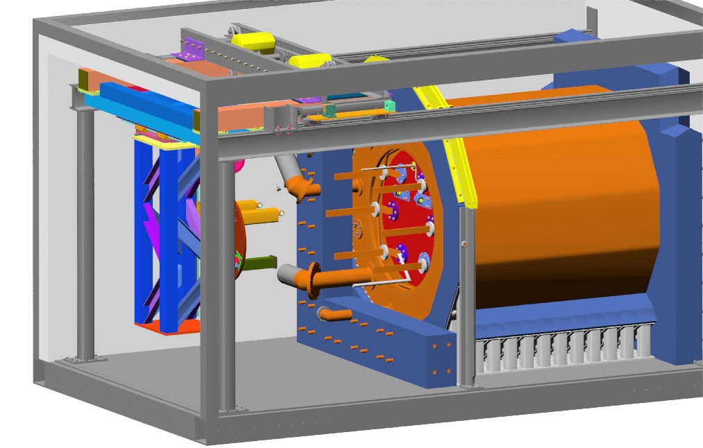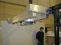 This rendering from the solid model shows the installation machine picking up the cold flange and inner vessel weldment off the transport cart.