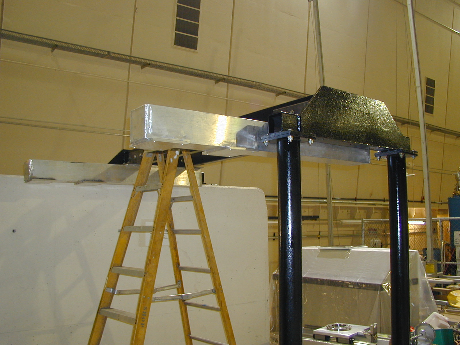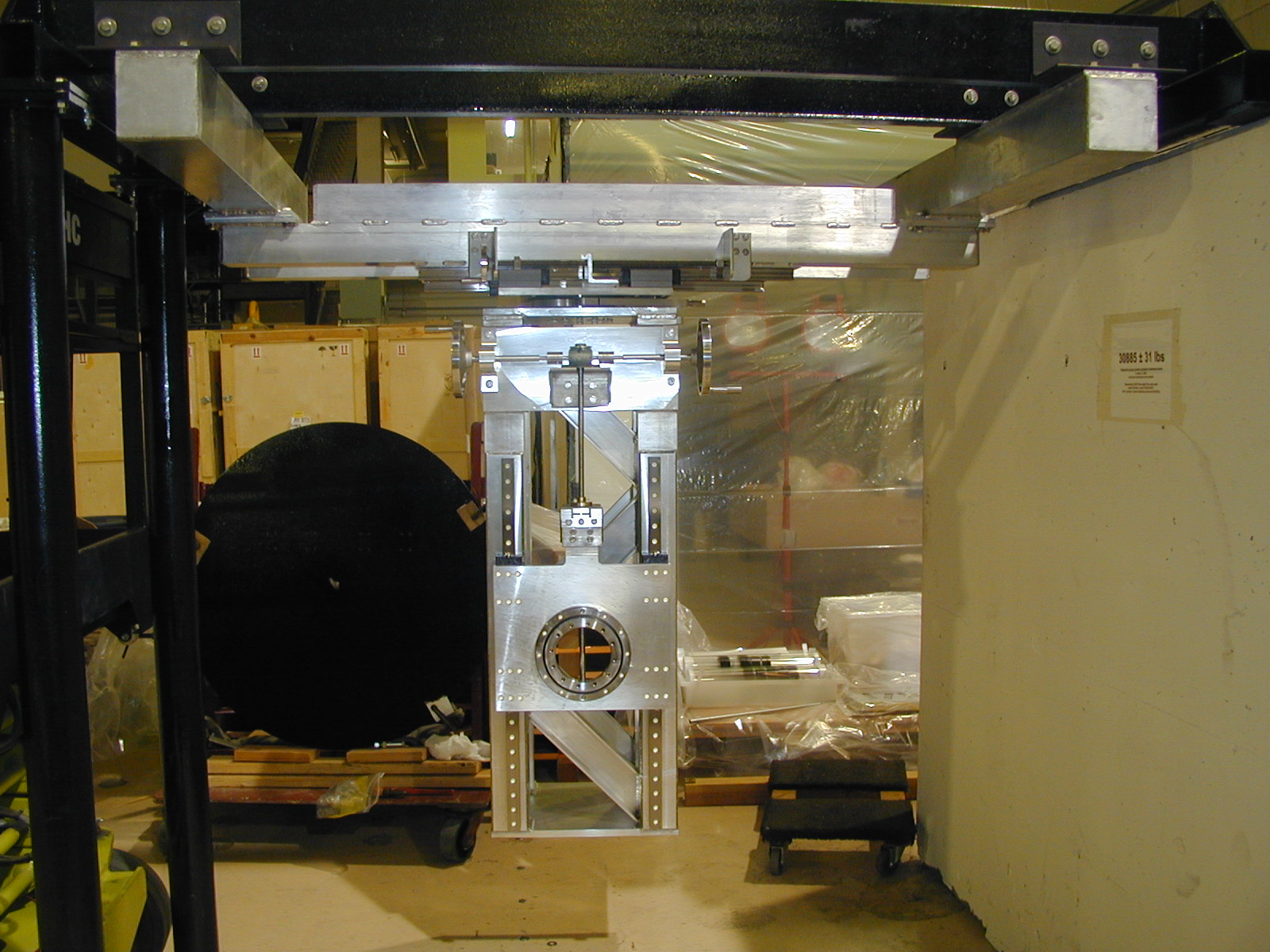 The black frame is a fixed stand-in for the Royce crane in Clean room 1. This test will hang from the black frame to do the required load test of the installation machine.