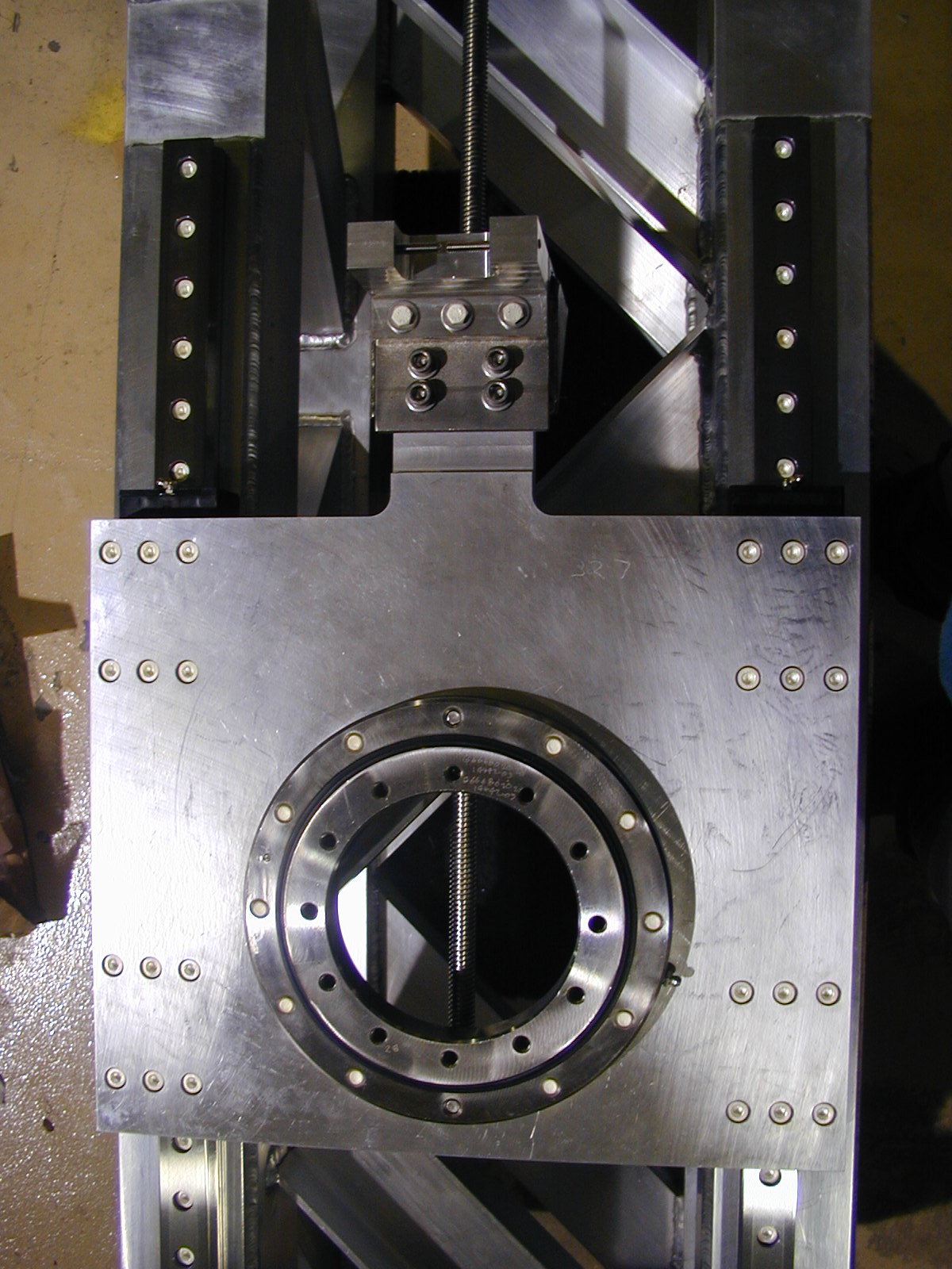 This picture shows the frame upside down that has the horizontal travel and the major yaw axis bearing.